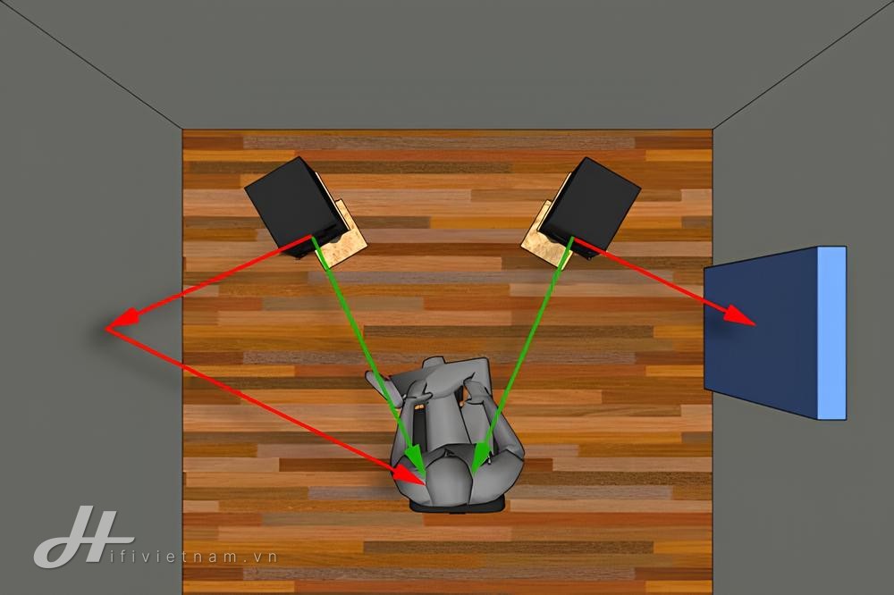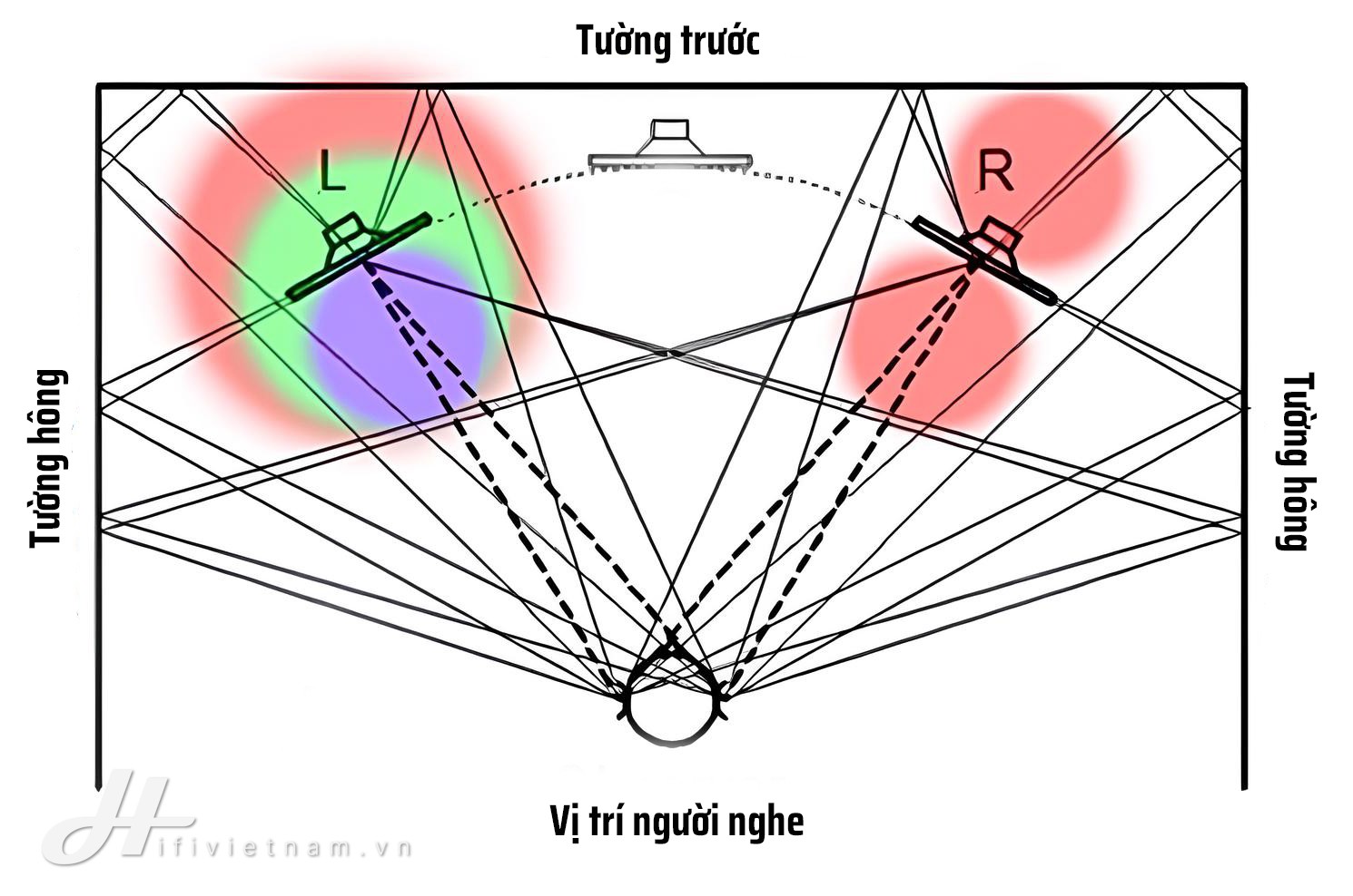 Cần biết rằng, âm thanh bạn nghe được không chỉ đến trực tiếp từ loa, mà là tổng hòa của: Âm phản xạ từ tường hai bên, Âm dội từ sàn và trần, Âm phản xạ phía sau loa và phía sau vị trí nghe, Âm trầm cộng hưởng tích tụ ở các góc phòng…