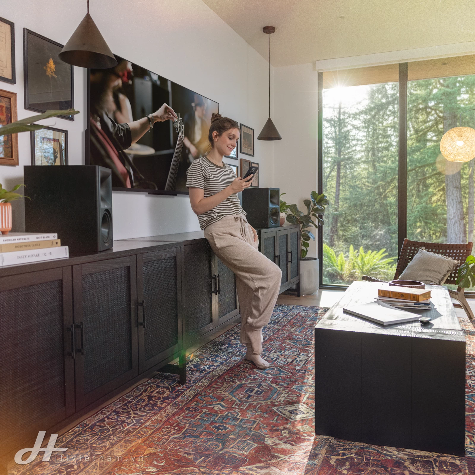 Kết quả là trường âm mở rộng theo chiều cao và chiều sâu, đủ để tạo cảm giác “immersive” cho phòng khách mà không biến setup thành một bài toán kỹ thuật phức tạp.