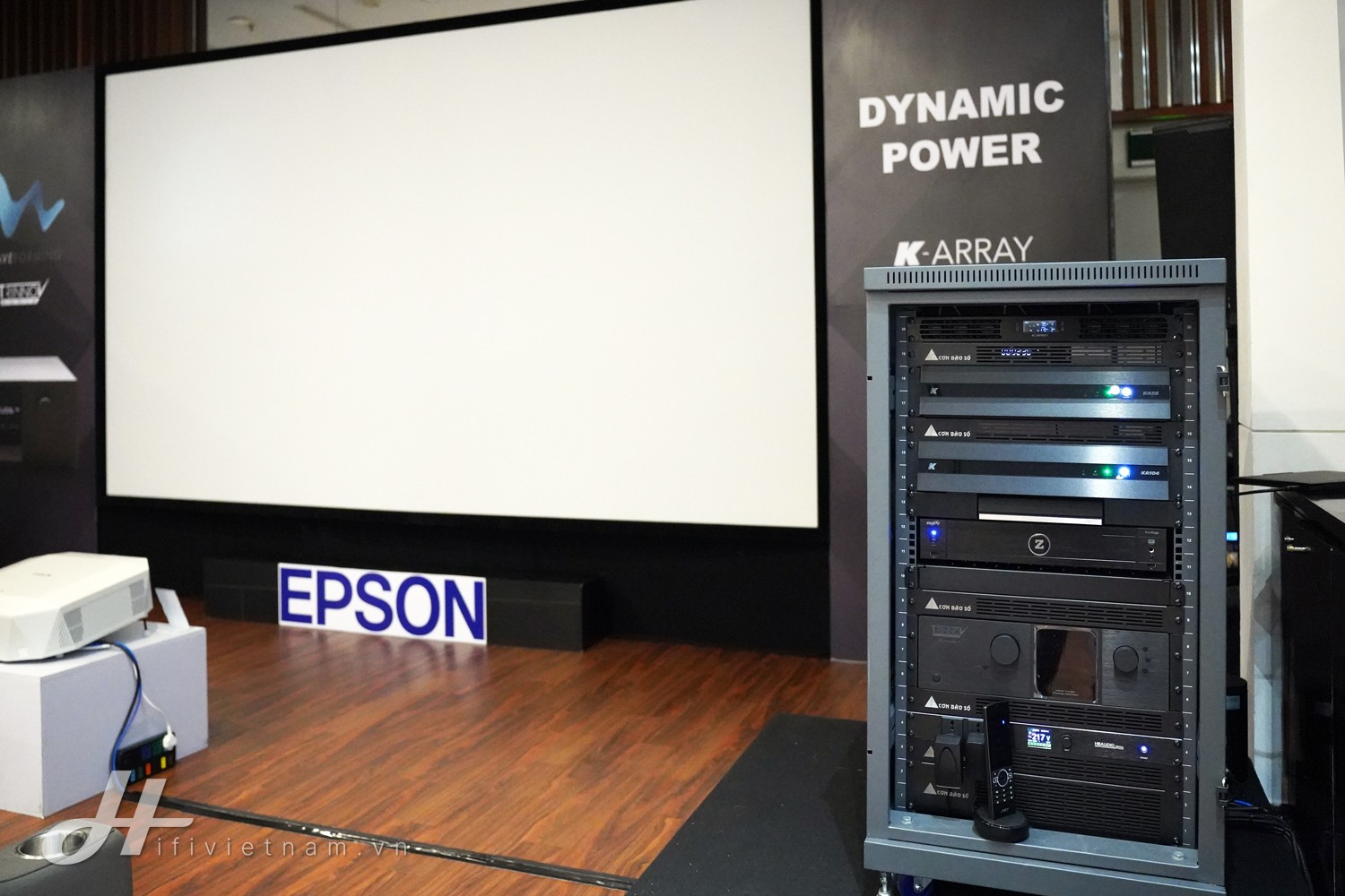Hệ thống loa vệ tinh K-array Domino KF210 được đặt ẩn phía sau màn chiếu xuyên âm, kéo bởi các ampli công suất K-array Komander KA104, KA28 mang đến âm thanh vô cùng mạnh mẽ và được tăng cường dải trầm bởi các subwoofer K-array Thunder KSC18P.