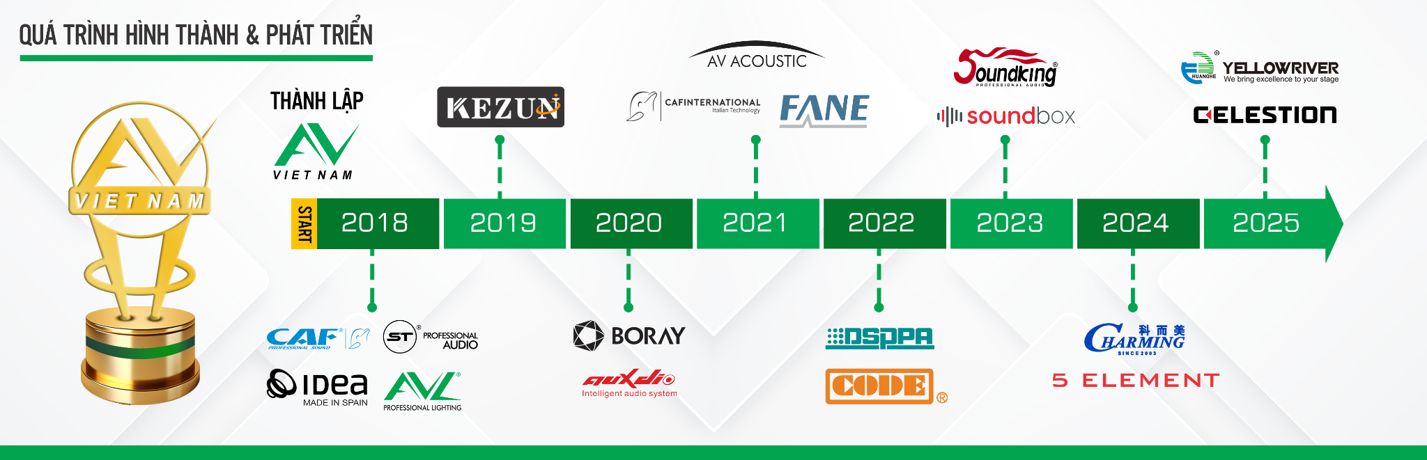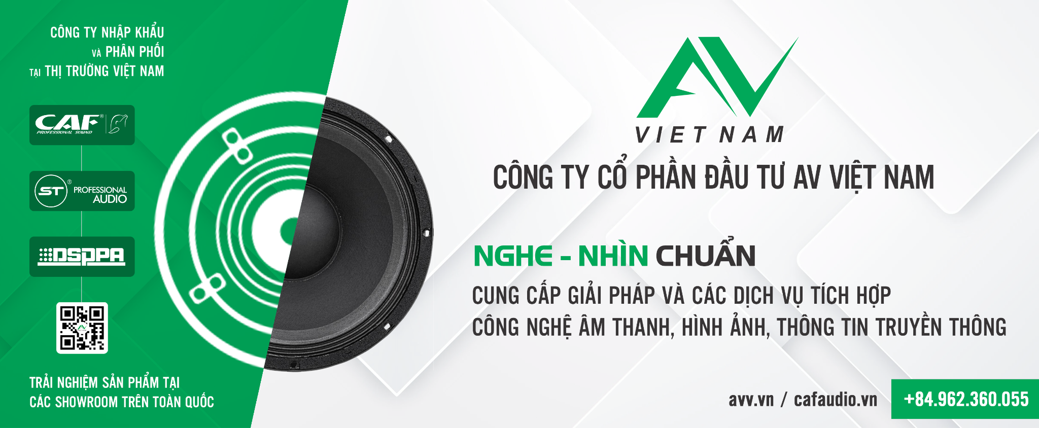 AV Việt Nam là nhà phân phối chính thức của nhiều thương hiệu nổi tiếng như CAF Audio, DSPPA, ST Audio, Idea, SoundBox, Fane, Faital Pro, Celestion, Bosch, TOA Electronic, Yellow River Lighting cùng nhiều thương hiệu quốc tế khác, đáp ứng đa dạng nhu cầu từ hội nghị, giáo dục, doanh nghiệp đến trình diễn nghệ thuật.