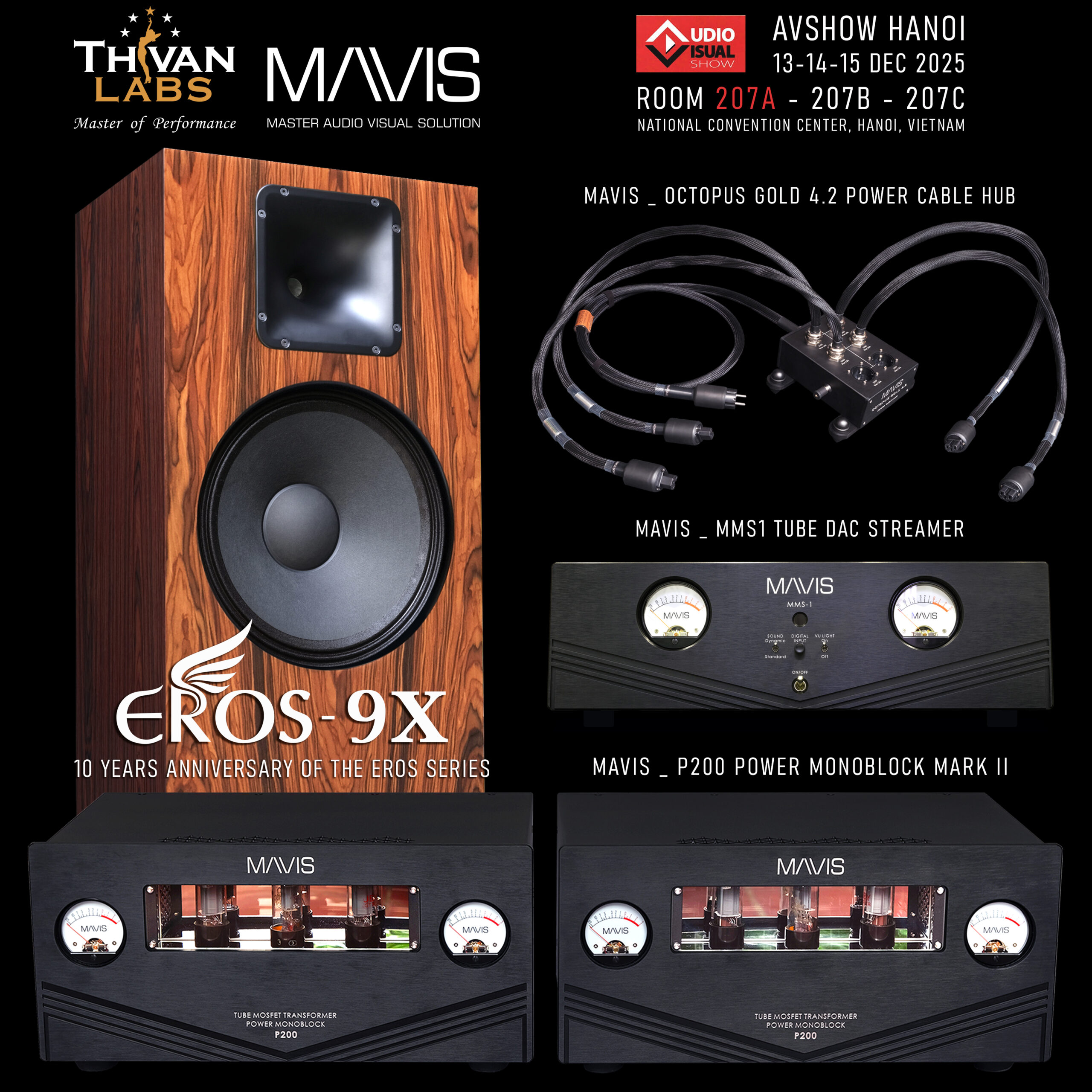 Tại AVshow Hà Nội 2025, ThivanLabs ra mắt mẫu loa Eros-9X, mẫu đầu tiên được giới thiệu trong series EROS-X – Kỷ niệm 10 năm nghiên cứu phát triển dòng loa Eros của ThivanLabs. EROS-X Series sẽ gồm ba model: Eros-9X, Eros-7X và Eros-5X. Eros-9X sẽ debut đầu tiên tại AVshow Việt Nam 12/2025, và tiếp đó debut quốc tế tại triển lãm German HiFi Days tại Hamburg, Đức vào tháng 1/2026. Kết hợp trong các hệ thống trình diễn với Eros-9X, là các sản phẩm mới nhất 2026 của Mavis Lab gồm: Bộ khuếch đại P200 Power Monoblock MARK II, bộ ampli tích hợp M100 MARK II (2 khối), ampli tích hợp M90P và nguồn phát nhạc số MMS-1 Tube DAC Streamer.